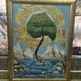 This textured painting brings to life a grand, towering tree standing strong amidst breathtaking mountains.